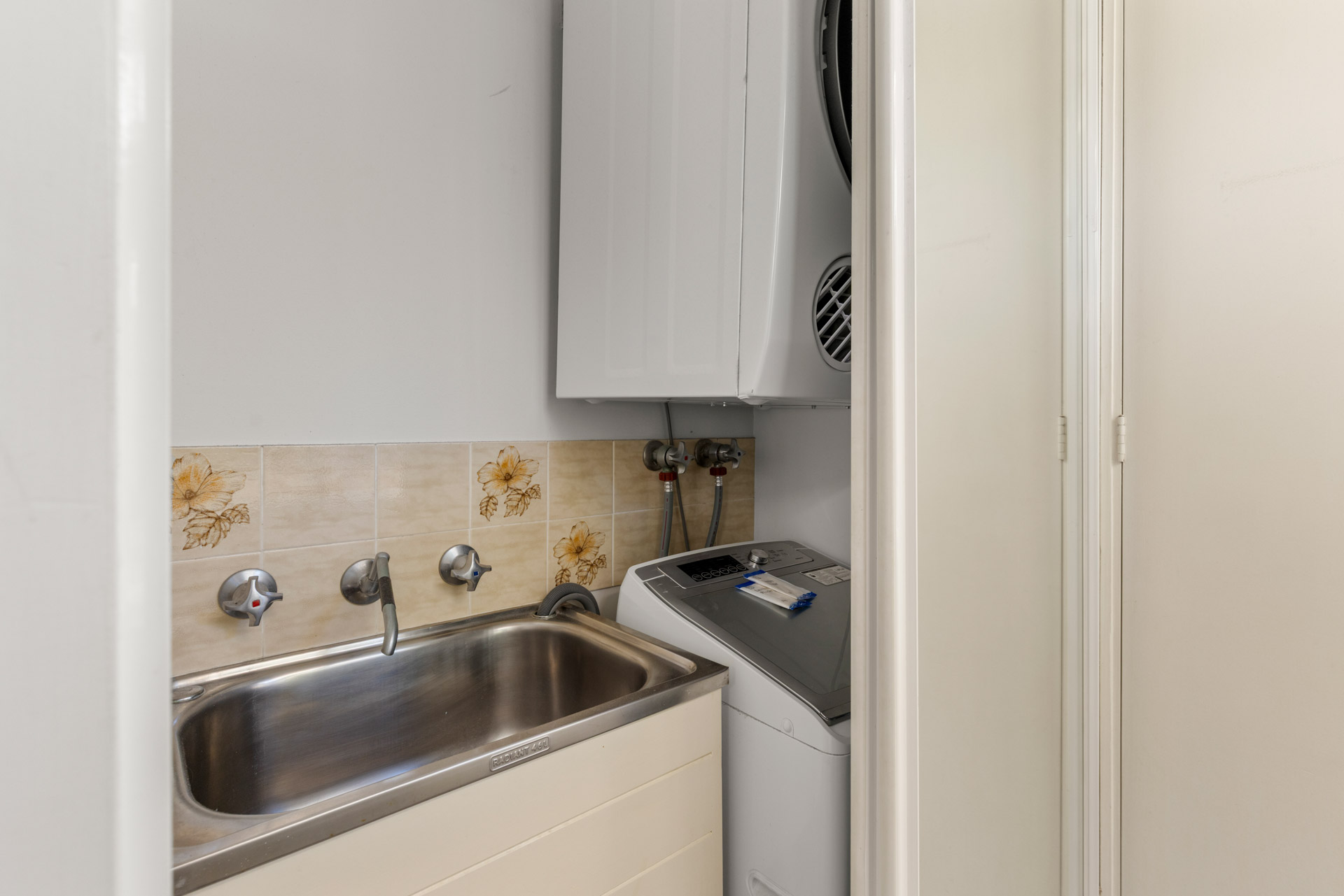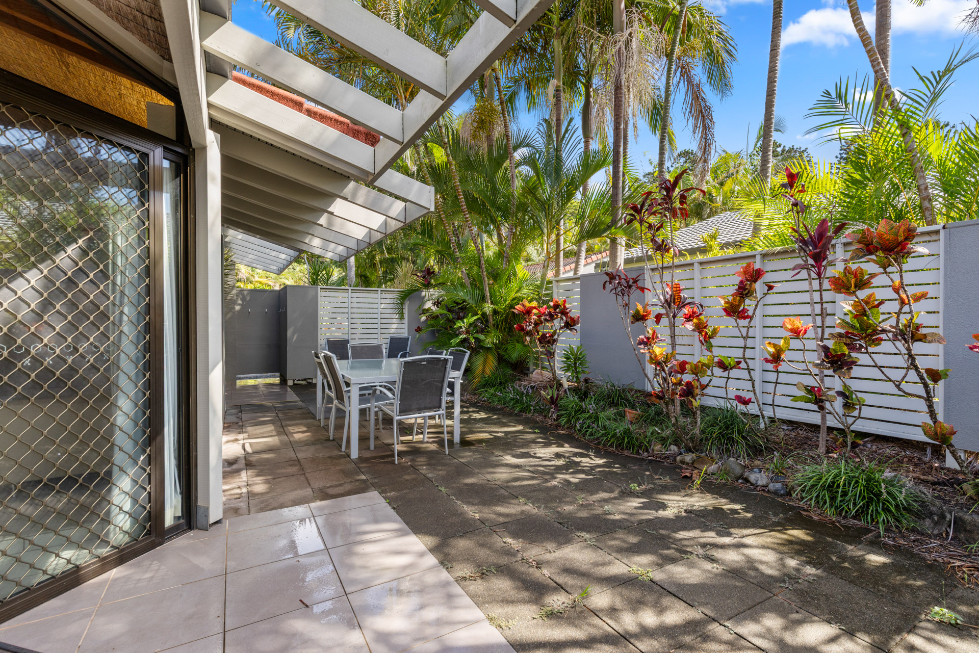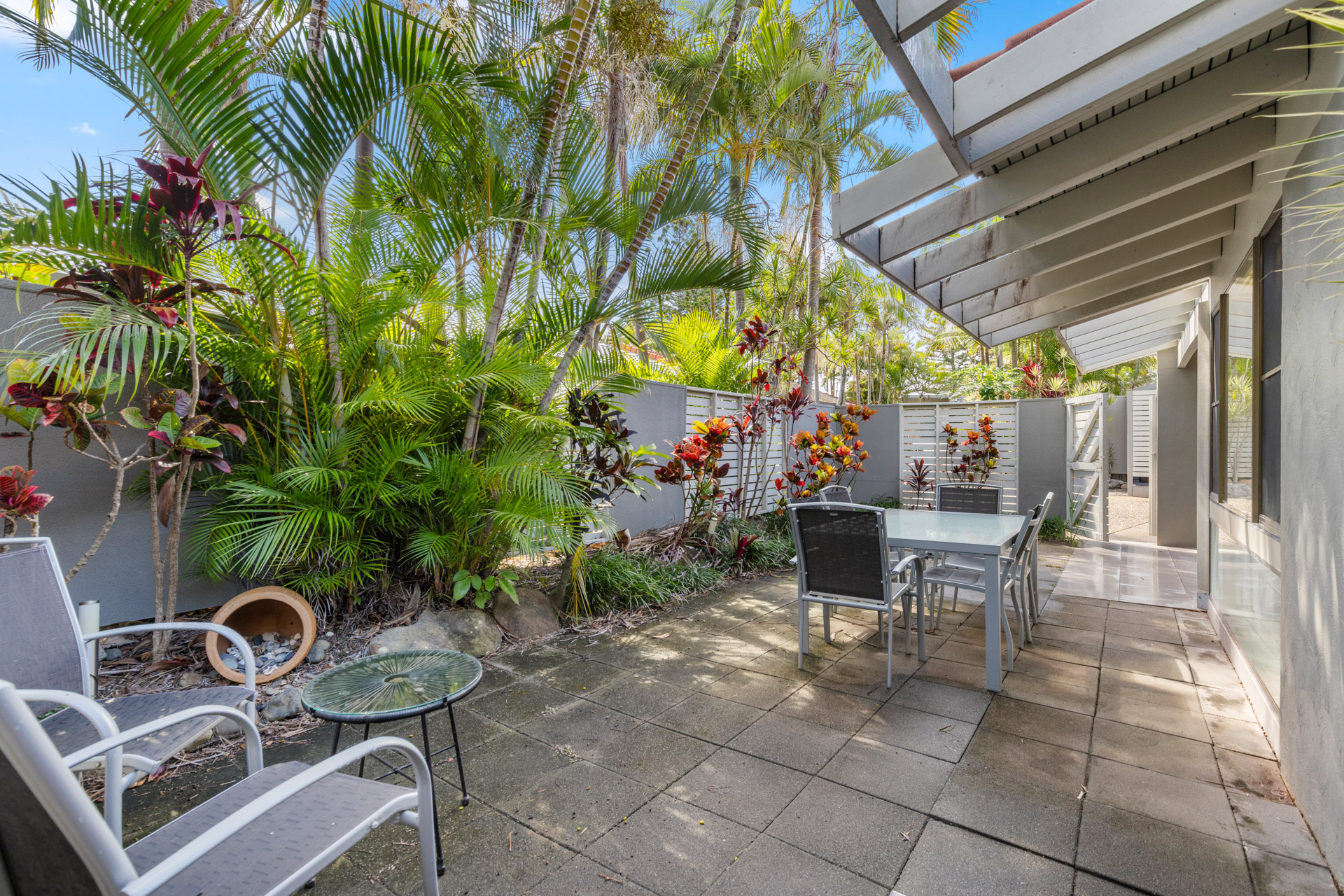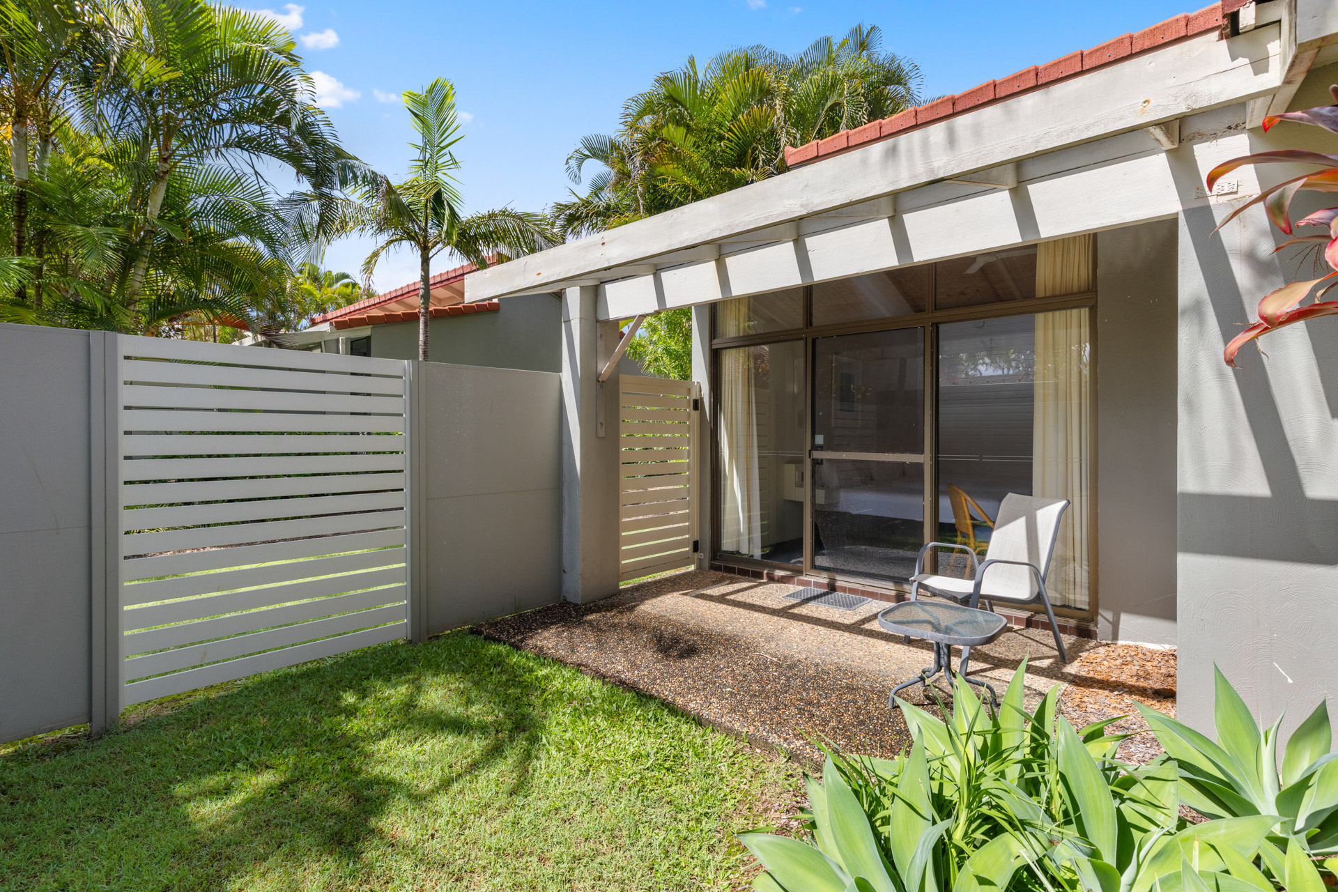 The private kitchen is well equipped for everyday use, including an oven, stovetop, refrigerator, and kitchenware. The apartment is equipped with laundry facilities making it ideal for longer stays or self-catered holidays. Step outside to your private patio with outdoor furniture, enjoy air-conditioned comfort indoors, or relax in the living area with a flat-screen TV.